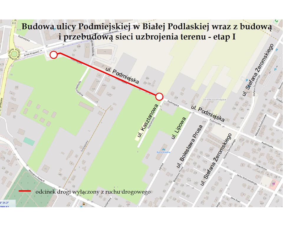 W związku z budową i przebudową sieci uzbrojenia terenu od 3 sierpnia br. zostanie wprowadzona czasowa organizacja ruchu. Będzie polegała na wyłączeniu z ruchu drogowego odcinka ulicy Podmiejskiej od ul. Fedorowicz do ul. Kasztanowej Wprowadzona organizacja ruchu podzielona została na etapy w taki sposób, aby zapewniony został dojazd do Niepublicznej Szkoły im. Janusza Korczaka.