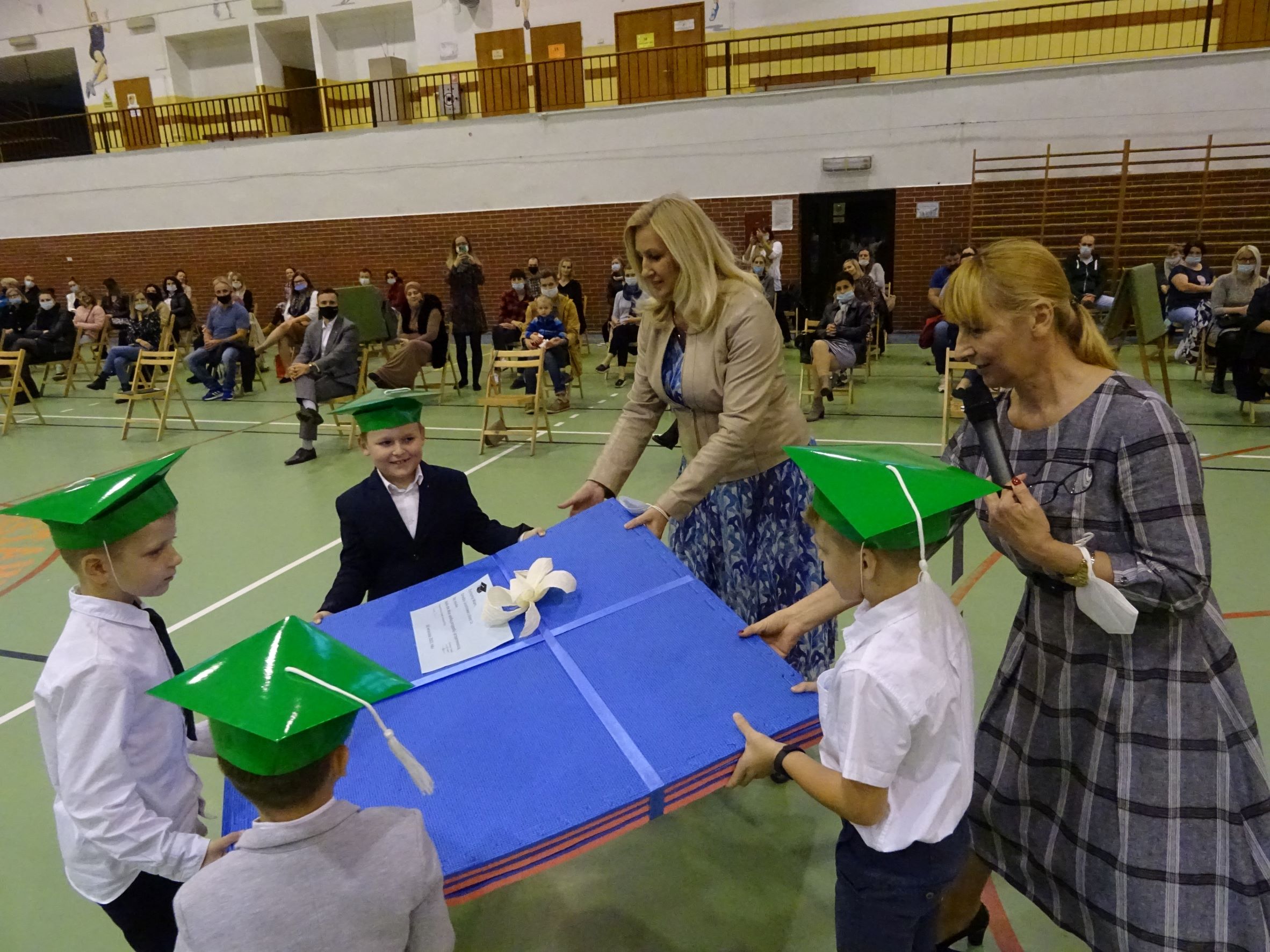 Starsi uczniowie z samorządu uczniowskiego zadeklarowali otoczenie opieką i wsparciem młodsze koleżanki i kolegów z klas pierwszych. Dyrektor wraz z Przewodniczącą Rady Rodziców szkoły przekazały pierwszakom maty do zabawy w sali lekcyjnej, życząc, by nauka była dla nich wielką przygodą i przyjemnością. Całej uroczystości przyglądał się z boku Miś Piątuś, który od wielu lat jest maskotką najmłodszych uczniów " Piątki" .
