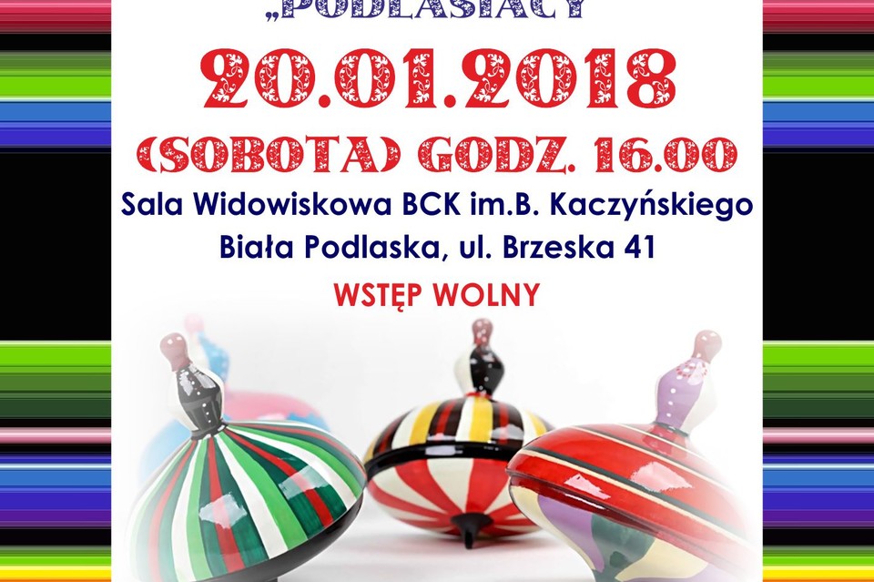 WiadomościBialskie Centrum Kultury zaprasza na koncert Zespołu Pieśni i Tańca "Podlasiacy" i Kapeli Ludowej "Podlasiacy" z okazji Dnia Babci i Dziadka.