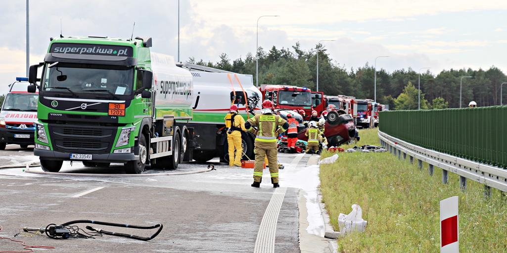 - Na trasie szybkiego ruchu S-19 na wysokości "MOP – Janów Lubelski Wschód„ na pasie ruchu w kierunku Lublina doszło do wypadku drogowego. Samochód ciężarowy cysterna przewożący około 10 tys. litrów substancji o kodzie 1202 nie zasygnalizował zamiaru zjazdu na MOP i rozpoczął proces hamowania. Jadący za min autobus wycieczkowy nie zdążył zahamować i z dużą siła uderzył w tył cysterny - informuje Komeda Wojewódzka Państwowej Straży Pożarnej w Lublinie. - W wyniku silnego uderzenia cysterna została postawiona w poprzek jezdni blokując dwa pasy ruchu. W autobusie podróżowało 42 osoby – wycieczka w Ukrainy. Jadące za autobusem z dużą szybkością samochody osobowe widząc to zaczęły nagły manewr hamowania w wyniku czego samochody osobowe uległy wypadkowi.